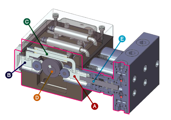 在吸入行程时,凸轮 D 将后方的柱塞 B 向后推进。